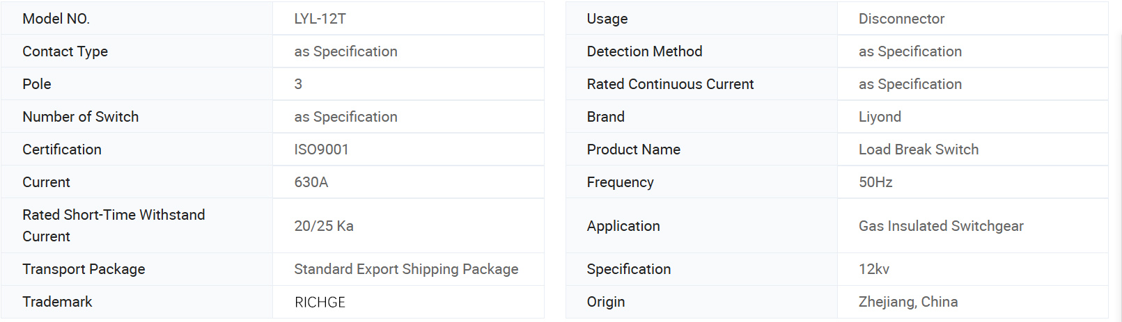 LYL-12T लोड स्विच GB3804-2004 "3.6kV~40.5kV हाई वोल्टेज AC लोड स्विच" और GB16926-1997 "AC हाई वोल्टेज लोड स्विच-फ्यूज संयोजन उपकरण" की प्रासंगिक आवश्यकताओं का अनुपालन करता है। मुख्य सर्किट: 630A-20kA (4s), 25kA (3s); यांत्रिक जीवन: 5000 बार; ग्राउंडिंग सर्किट: 20kA (2s); यांत्रिक जीवन: 2000 बार.