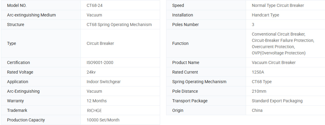 मॉडल CT68 -24 इनडोर वैक्यूम सर्किट ब्रेकर CT68 स्प्रिंग ऑपरेटिंग तंत्र के साथ उपयोग करता है। यह 24kV के वोल्टेज के साथ तीन-चरण एसी, 50 हर्ट्ज इनडोर पावर डिट्रेशन उपकरण है।