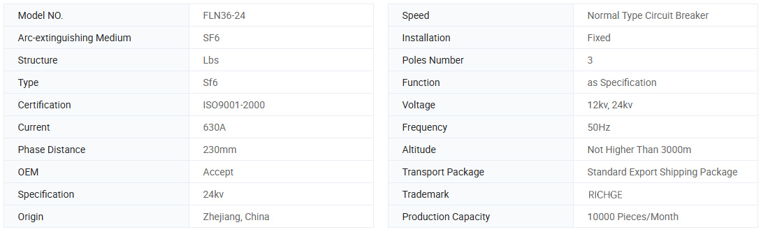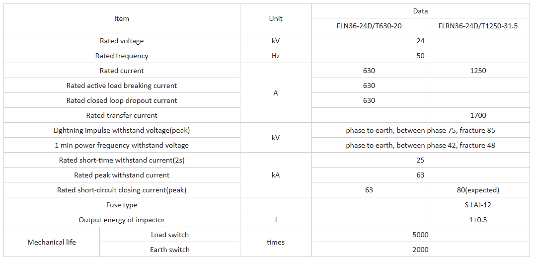 FLN36-12 (24) D/630-20 इनडोर AC हाई वोल्टेज SF6 लोड ब्रेक स्विच और FLRN36-12 (24) D/100-31.5 इनडोर AC उच्च वोल्टेज SF6 लोड ब्रेक स्विच-फ्यूज संयोजन का उपयोग तीन-चरण AC 50/60Hz RMU और टर्मिनल पावर स्टेशन के लिए किया जाता है। स्विच लोड स्थितियों में 10KV, 24KV और 35kV पावर सिस्टम की रक्षा के लिए उपयुक्त हैं। स्विच ऑन-लोड वर्तमान, बंद लूप करंट, नो-लोड ट्रांसफार्मर क्षमता और केबल चार्जिंग करंट को बंद कर सकता है। फ्यूज संयोजन के साथ स्विच किसी भी करंट को काट सकता है जब वर्तमान रेटेड शॉर्ट-सर्किट ब्रेकिंग करंट की सीमा में होता है। वे आरएमयू, संयुक्त ट्रांसफार्मर, आदि के लिए उपयुक्त हैं।