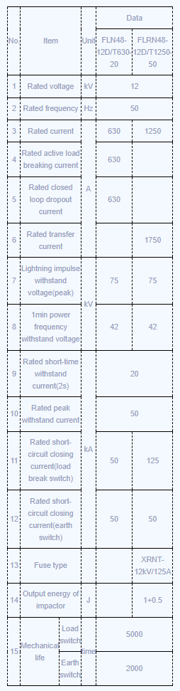 FLN48-12D प्रकार के तकनीकी पैरामीटर इनडोर HV SF6 लोड ब्रेक
