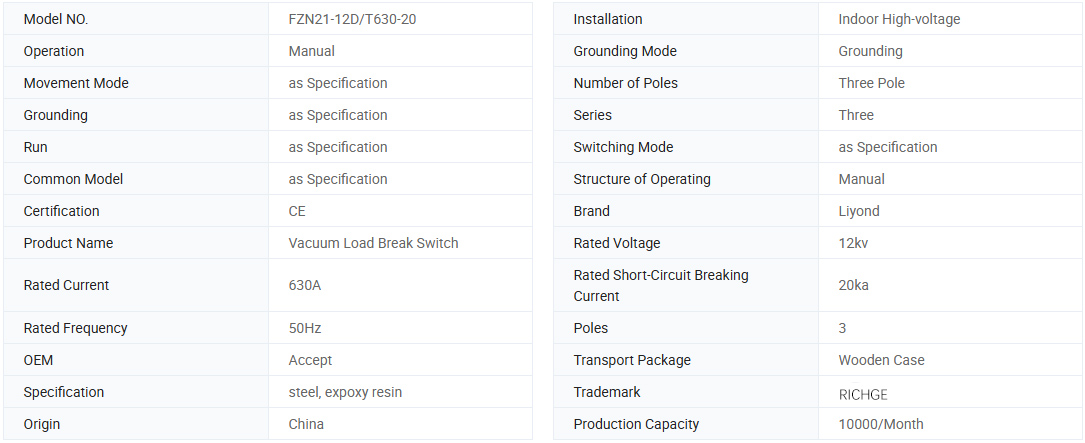 FZN21-12D/T630-20 इनडोर उच्च वोल्टेज वैक्यूम लोड ब्रेक स्विच, 10kV तीन-चरण AC 50Hz के रेटेड वोल्टेज के साथ PowerSupply नेटवर्क के लिए उपयुक्त है, जिसका उपयोग लोड करंट को तोड़ने के लिए किया जाता है।