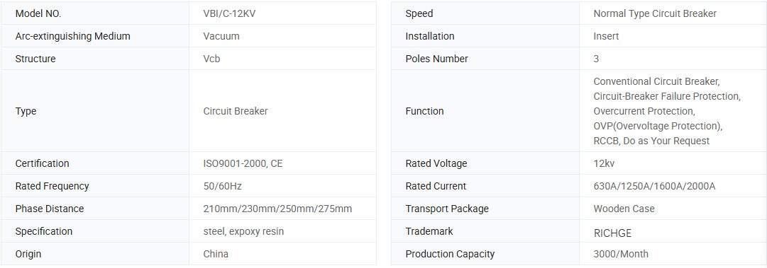 VBI-12 मध्यम वोल्टेज वैक्यूम सर्किट ब्रेकर 50Hz/60Hz तीन चरण AC 12KV रेटेड वोल्टेज के साथ एक प्रकार का इनडोर मध्यम वोल्टेज स्विच उपकरण है, जिसने स्विट्जरलैंड में एबीबी निगम की तकनीक को जोड़ा और चीन में विकसित किया। उत्पाद मानक GB1984 और IEC62271-100 के साथ अनुपालन करता है।