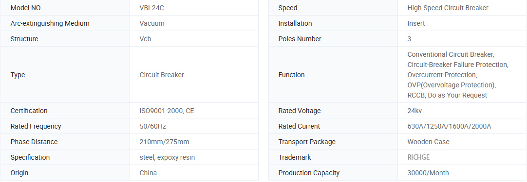 VBI-24 मध्यम वोल्टेज वैक्यूम सर्किट ब्रेकर 50Hz/60Hz तीन चरण AC 24KV रेटेड वोल्टेज के साथ एक प्रकार का इनडोर मध्यम वोल्टेज स्विच उपकरण है, जिसने स्विट्जरलैंड में एबीबी निगम की तकनीक को जोड़ा और चीन में विकसित किया। उत्पाद मानक GB1984 और IEC62271-100 के साथ अनुपालन करता है।