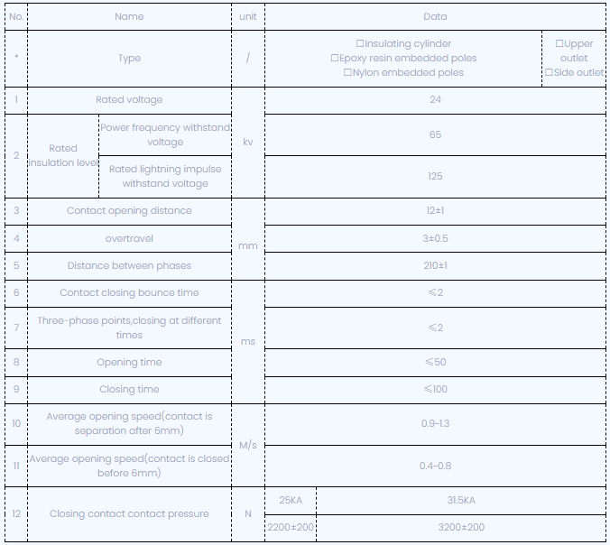 VBI-24 साइड माउंटेड टाइप VCB का मुख्य तकनीकी विनिर्देश