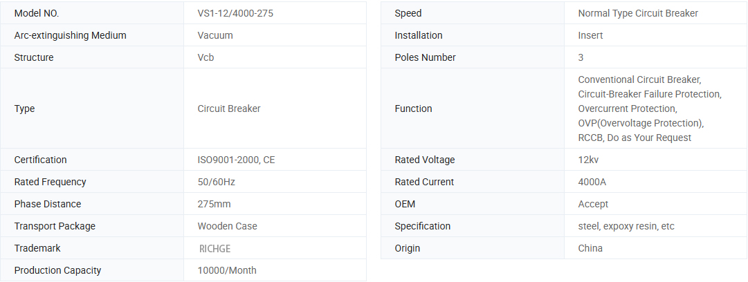 VBI-24 साइड माउंटेड टाइप वैक्यूम सर्किट बीकर के संचालन तंत्र का उपयोग वसंत में भंडारण ऊर्जा के लिए किया जाता है, जिसे दो तरीकों, मैनुअल या इलेक्ट्रिकल द्वारा संचालित किया जा सकता है। विशेषताएं GB1984-89 , JB3855-96 <10KV इनडोर उच्च वोल्टेज वैक्यूम सर्किट ब्रेकर सामान्य तकनीकी विनिर्देशों> के अनुसार हैं, IEC56 मानक के प्रासंगिक प्रावधान।