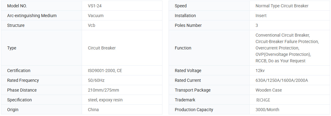 VS1-24 इनडोर उच्च वोल्टेज वैक्यूम सर्किट ब्रेकर के साथ आम अछूता सिलेंडर के साथ श्रृंखला तीन-वाक्य A.C. 50 हर्ट्ज इनडोर बिजली वितरण उपकरण 24kV के रेटेड वोल्टेज के साथ है। इसका उपयोग उद्योग और खनन उद्यम, बिजली संयंत्रों और सबस्टेशन के क्षेत्रों में विद्युत उपकरणों को नियंत्रित करने के लिए किया जाता है। यह प्रकार वैक्यूम सर्किट ब्रेकर राष्ट्रीय मानकों के अनुरूप होता है और IEC मानक की वजीफा, क्षमता M2-E2-C2 के ग्रेड तक पहुंचती है।
