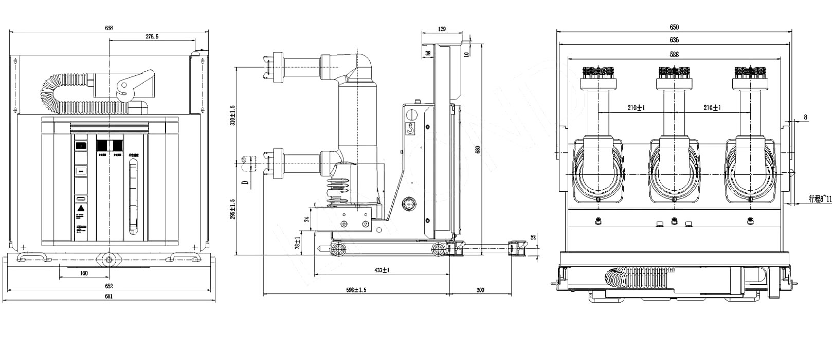 फिक्स्ड पोल के साथ वीएसजी -12/2000 ए हैंडकार्ट टाइप वैक्यूम सर्किट ब्रेकर के आयाम