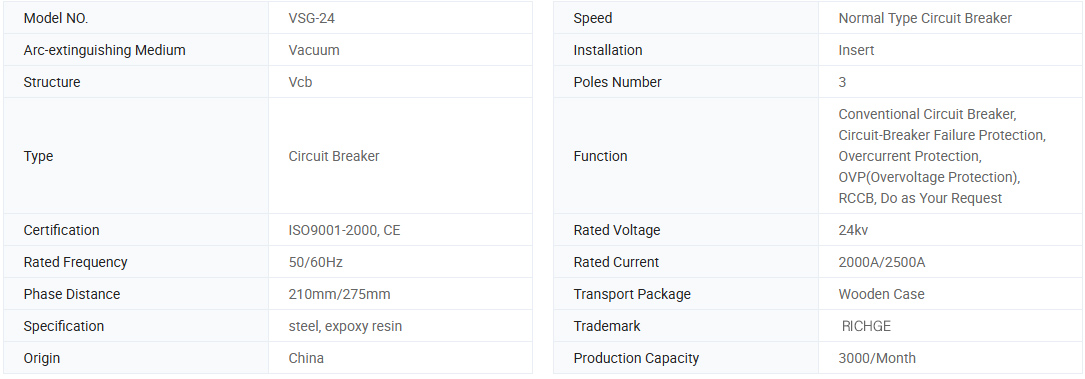 वीएसजी -24 सीरीज़ इनडोर हाई वोल्टेज वैक्यूम सर्किट ब्रेकर के साथ एम्बेडेड डंडे के साथ तीन चरण A.C 50Hz इनडोर पावर डिस्ट्रीब्यूशन उपकरण 24kV के रेटेड वोल्टेज के साथ हैं। इसका उपयोग उद्योग और मिंग उद्यम, बिजली संयंत्रों और सबस्टेशन के क्षेत्रों में विद्युत उपकरणों की सुरक्षा और नियंत्रण के लिए किया जाता है।